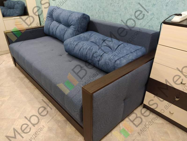 Диван этот заказывали с большей глубиной (1200). Спальное место в не разобранном виде получилось 96х190. Очень нравится материал на подушках приятный такой велюр. Основной материал обивки при заказе выбрали рогожку. Диван тяжелый, механизм внутри металлический. Имеется ящик вместительный. Довольны.