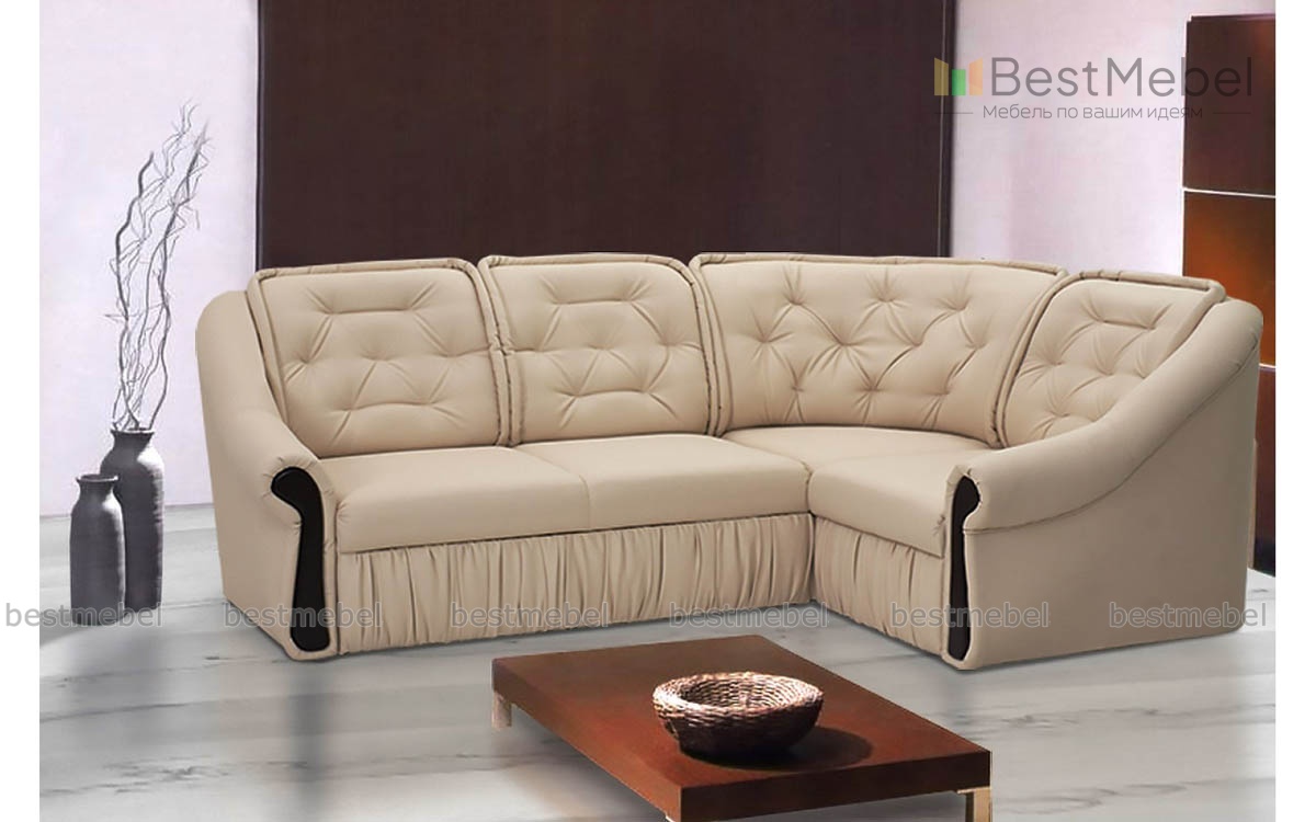 Угловой диван раскладывается под спальное место. Есть ящик для белья. К спинке дивана подушки крепятся на молнии. Спальное место выдвигается при помощи механизма "дельфин". При заказе можно изменить размеры и цвет обивки.
