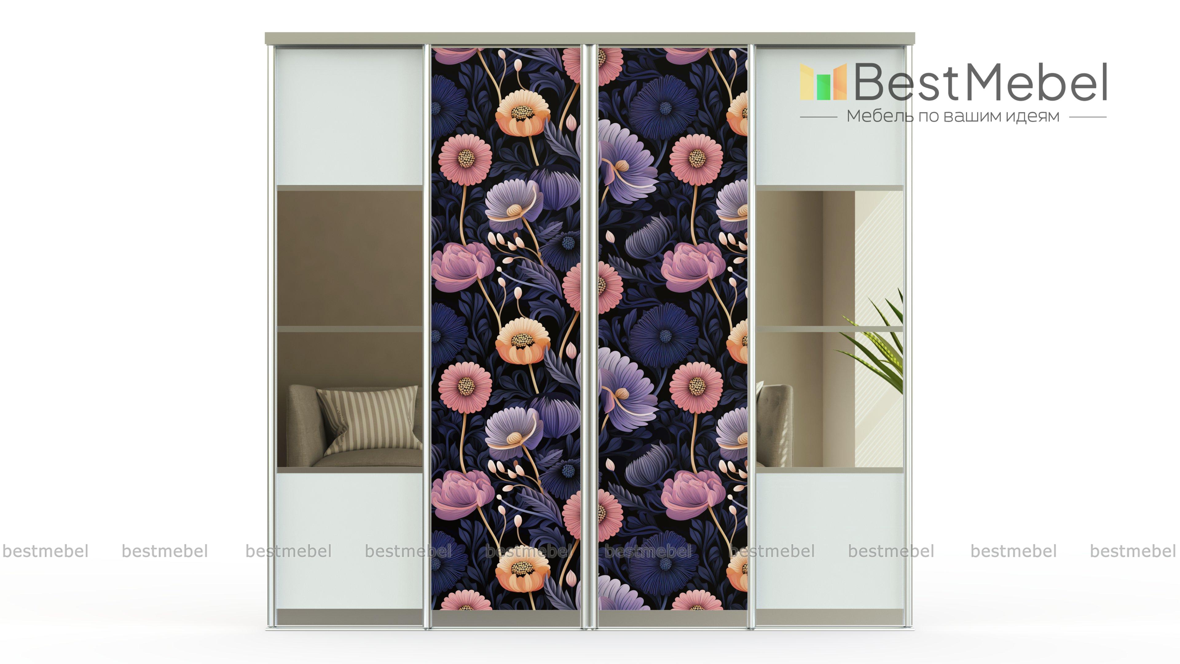 Двери-купе Норт 1 BMS - это композиция из двух полотен с фотопечатью и двух комбинированных. Насыщенный цветочный принт красиво смотрится на древесном фоне, а зеркала делают комнату визуально светлее и больше. Универсальное решение для отделки раздвижных дверей - алюминиевый профиль в серебристом оттенке, прочный и одновременно легкий. Купить двери-купе Норт 1 BMS для обустройства современной системы хранения вы сможете недорого в нашем интернет-магазине.