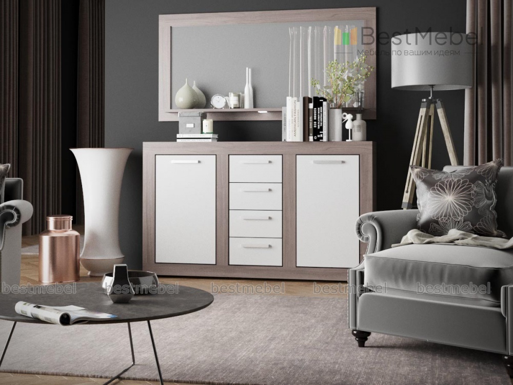 Комод PURE BMS – роскошная модель для гостиной или спальни, объединившая все достоинства стиля минимализм. Модель имеет классическое наполнение – четыре выдвижных ящика и два распашных отделения, просторная столешница идеально подходит для предметов декора, широкое зеркало оборудовано подсветкой. Актуальная расцветка корпуса имитирует поверхность дерева, фасады – роскошный белый глянец, устойчивый к сколам и царапинам. Надежная эргономичная фурнитура обеспечит комфортное пользование и долговечность. Купить комод PURE BMS по лучшей цене приглашаем в наш интернет-магазин.