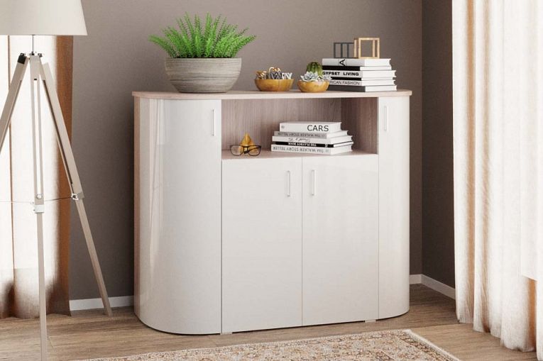 Комод радиусный Этюд 3 BMS поможет вам интересно оформить зону ТВ, разместить предметы декора и множество бытовых мелочей. Эффектная модель с выпуклым фасадом оборудована широкой скругленной столешницей, нишей под аппаратуру и просторными распашными отделениями с полками. В оформлении комода скомбинированы насыщенные древесные тона и белый глянец. Купить комод радиусный Этюд 3 BMS для меблировки гостиной или спальни приглашаем в наш интернет-магазин.