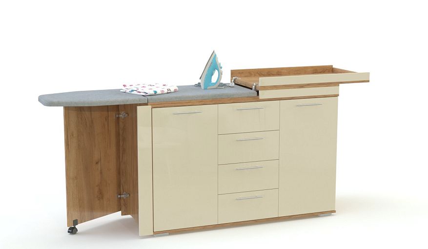 Комод Рассвет 2 BMS с цветным глянцевым фасадом станет ярким акцентом в интерьере современной квартиры. Вы сможете использовать комод для хранения домашнего текстиля и бытовых вещей, а при необходимости превратить в гладильную доску, сэкономив на отдельном аксессуаре. Широкая модель оборудована четырьмя выдвижными ящиками, двумя распашными отделениями, складной секцией на выкатной опоре и скрытой под откидной столешницей рабочей поверхностью. Купить комод Рассвет 2 BMS приглашаем в наш интернет-магазин с выбором цвета и фурнитуры по каталогу.