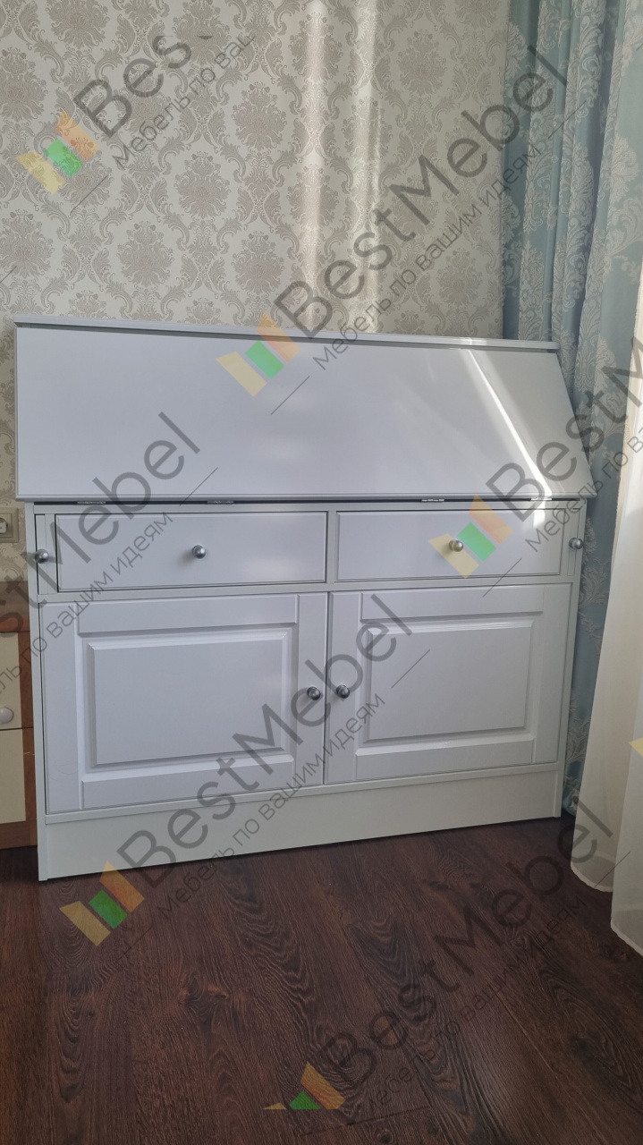 Преобрели комод - секретер в качестве рабочего места ребёнку. Цвет перламутр жемчужный, фасад с фрезеровкой. Отлично вписался в интерьер. Ребёнок счастлив. Единственный минус, не было подробной инструкции по сборке. Вложили только схему с сайта, собирали самостоятельно и потратили целый день.