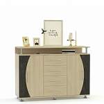 Комод София New BMS с декором в стиле модерн эффектно дополнит интерьер спальни, гостиной или прихожей. Оборудованный четырьмя выдвижными ящиками, двумя распашными отделениями и просторной нишей, комод разместит одежду и домашний текстиль, книги и декоративные мелочи. В оформлении модели скомбинированы контрастные древесные тона, устойчивость конструкции обеспечивают круглые металлические опоры. Купить комод София New BMS для хранения большого количества вещей вы сможете в нашем интернет-магазине.