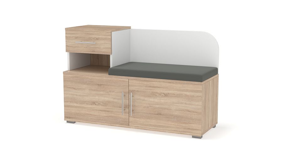 Обувница Ариадна BMS – это многофункциональная модель, объединившая удобную систему хранения и банкетку. Распашная тумба для обуви дополнена надстройкой с нишей и выдвижным ящиком для мелочей, а также сиденьем в мягкой тканевой обивке и скругленной спинкой. Обувница выполнена в контрастных древесных тонах и гармонично дополнит интерьер как просторных, так и малогабаритных прихожих. Купить обувницу Ариадна BMS приглашаем в наш интернет-магазин по доступной цене.