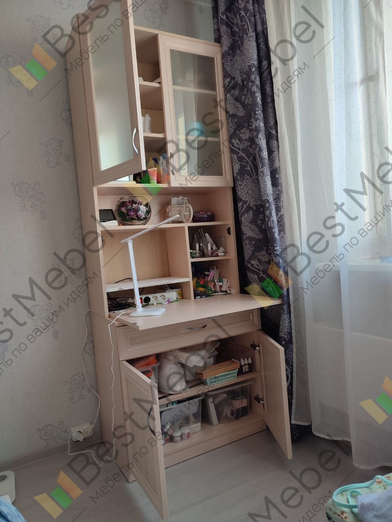 Очень удобный секретер! Брали на дачу в очень узкую комнату, чтобы организовать рабочее место за письменным столом. В итоге отлично получилось, небольшой монитор отлично встал в секретер, и за ноутбуком удобно посидеть. Крышку секретера просили сделать небольшой 48см, а высоту стола 73 см-все сделали как надо! Единственный незначительный минус-ручки на дверцах немного на разной высоте, но в глаза не бросаются.