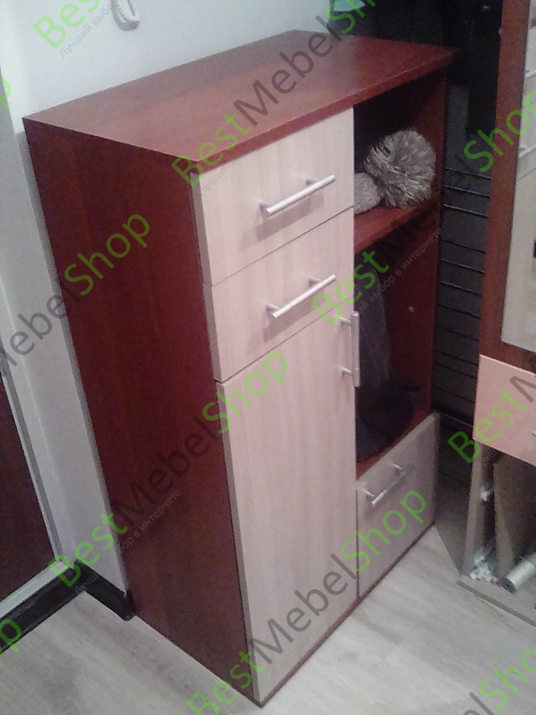 Нужен был узкий высокий комод в мини-прихожую (в комплекте со шкафом), заказали по своим размерам в бестмельшоп. Собирали сами, причем решили несколько иначе расположить полки: убрали полку из правого среднего открытого отделения, сделав там место для рюкзаков, а эту самую освободившуюся полку установили в нижний правый отсек за квадратную дверку (просверлив 4 отверстия) и там получилось две полочки для обуви.