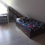 Кровать заказывала в детскую, с несурозным потолком. Не знала как вообще всё устрою, но стеллажи и кровать выручили. Получилась очень даже уютная детская. Внучка её любит.