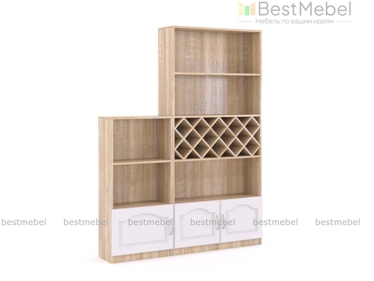 Набор стеллажей Сабрина 7 BMS гармонично впишется в классические интерьеры. В набор входят два стеллажа – большой и малый, оборудованные открытыми полками для бокалов и декоративных предметов, распашными отделениями и крестовой бутылочницей для вин. В оформлении стеллажей скомбинированы древесные тона и белый с фрезеровкой, эффектно подчеркивая выставленные предметы. Купить набор стеллажей Сабрина 7 BMS для гостиной или просторной кухни вы сможете в нашем интернет-магазине.