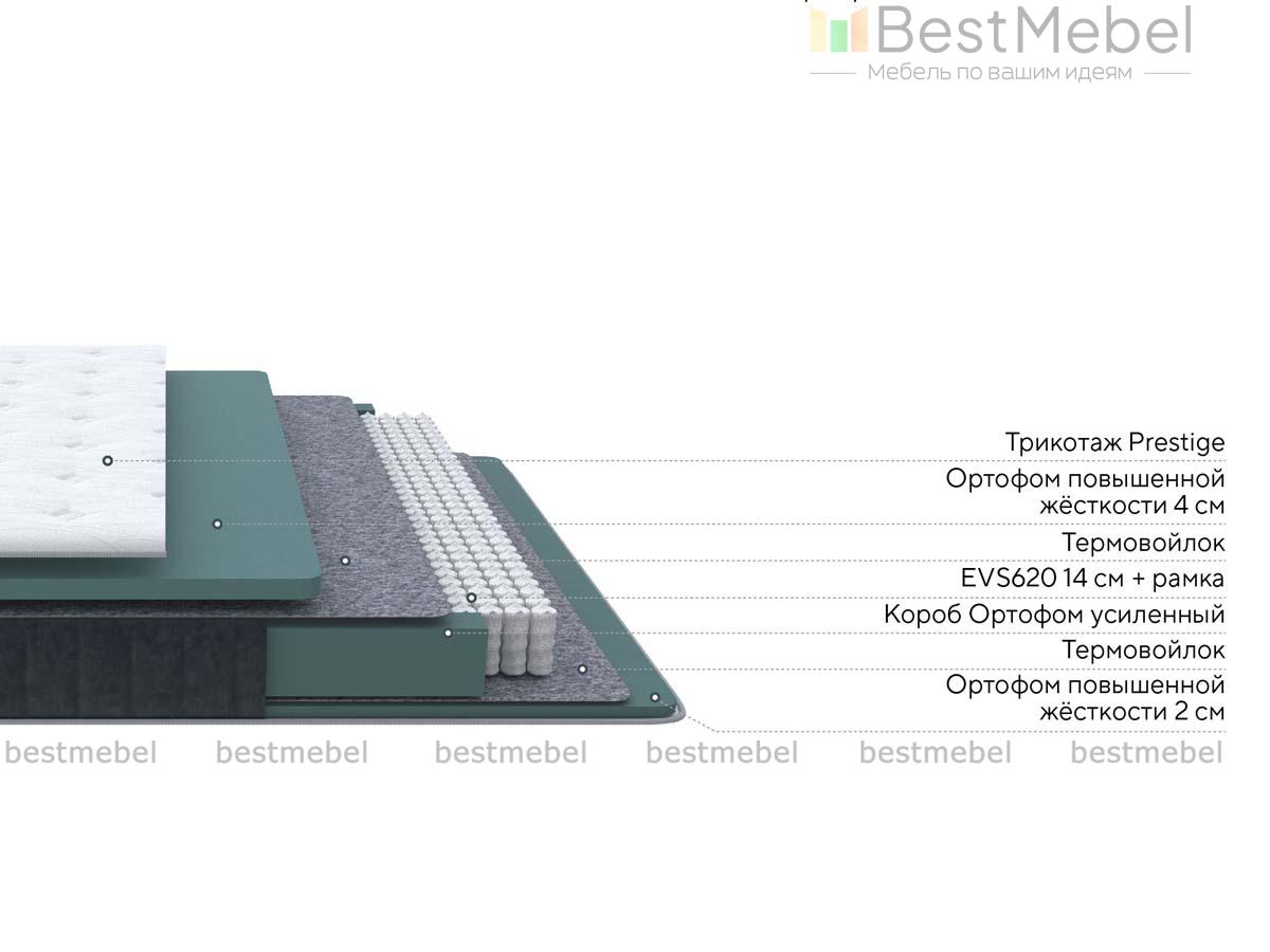 Матрас Prestige Medium Steel со средней жесткостью обеспечивает оптимальное соотношение комфорта и поддержки. Блок EVS620 с автономной работой пружин проложен слоями эластичной пены Ортофом толщиной 4 и 2 см, надежно изолированной термовойлоком. Дышащий трикотажный чехол с нежной поверхностью простеган с холлофайбером и ППУ, для бурлета использован прочный микровелюр цвета Steel. Купить матрас Prestige Medium Steel в одном из размеров линейки вы сможете на сайте нашего интернет-магазина.