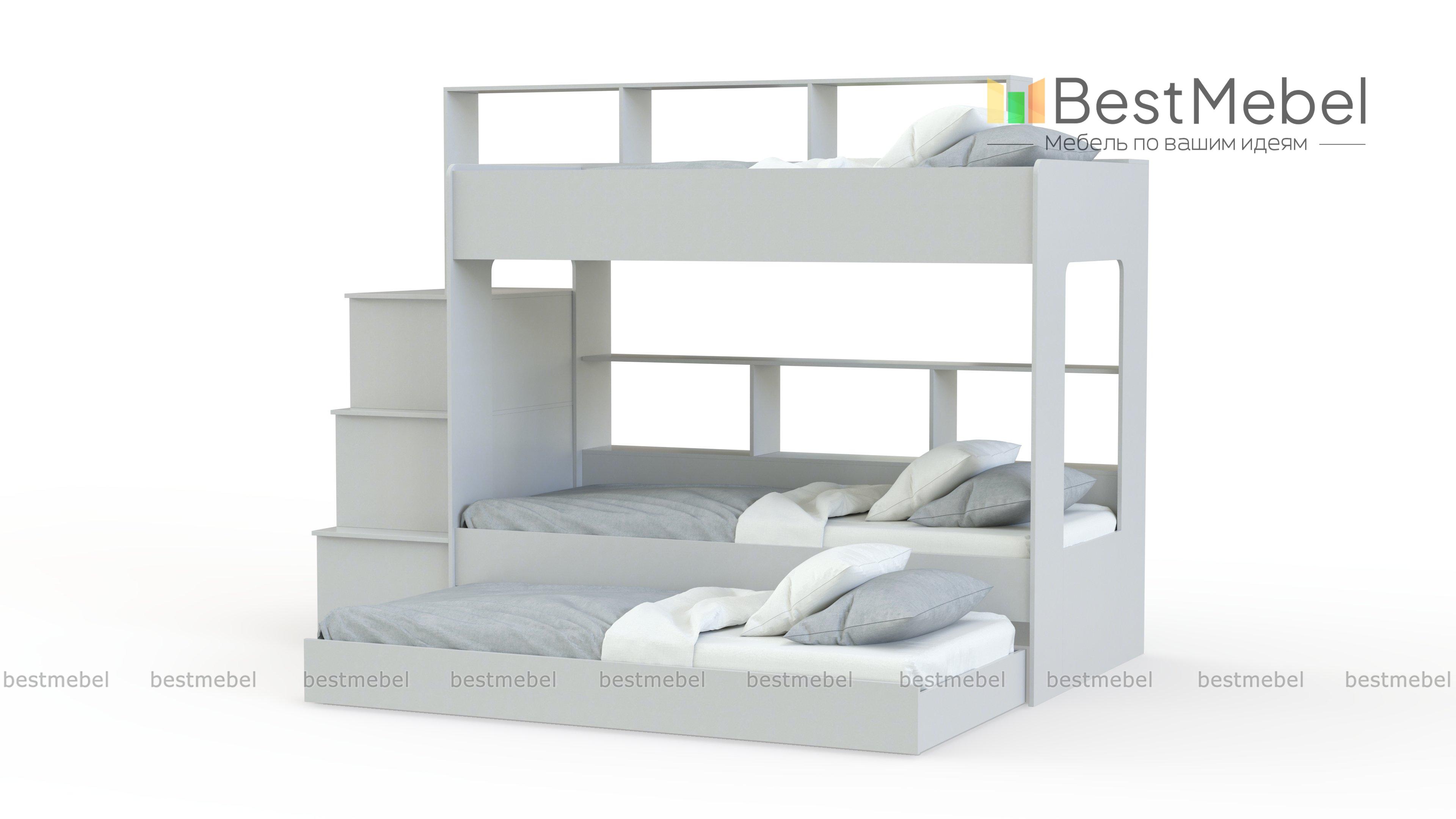 Детская двухъярусная кровать Антошка BMS – стильная, функциональная, привлекательная модель с 3-мя спальными местами. Два на разных «этажах», третье выкатывается из-под нижнего. Постели просторные, с прочным основанием. Лесенка с перилами и возможностью разместить книги, игрушки. Задняя стенка представляет собой стеллаж со множеством секций, где владельцы расставят свои вещи, элементы декора, книги. Благодаря продуманному дизайну модель смотрится воздушно, великолепно вписывается на небольшую площадь комнаты в современном стиле. Материал изготовления – ЛДСП, кромка ПВХ, цветовая гамма в вариациях (пастель, имитация древесины, яркие оттенки).