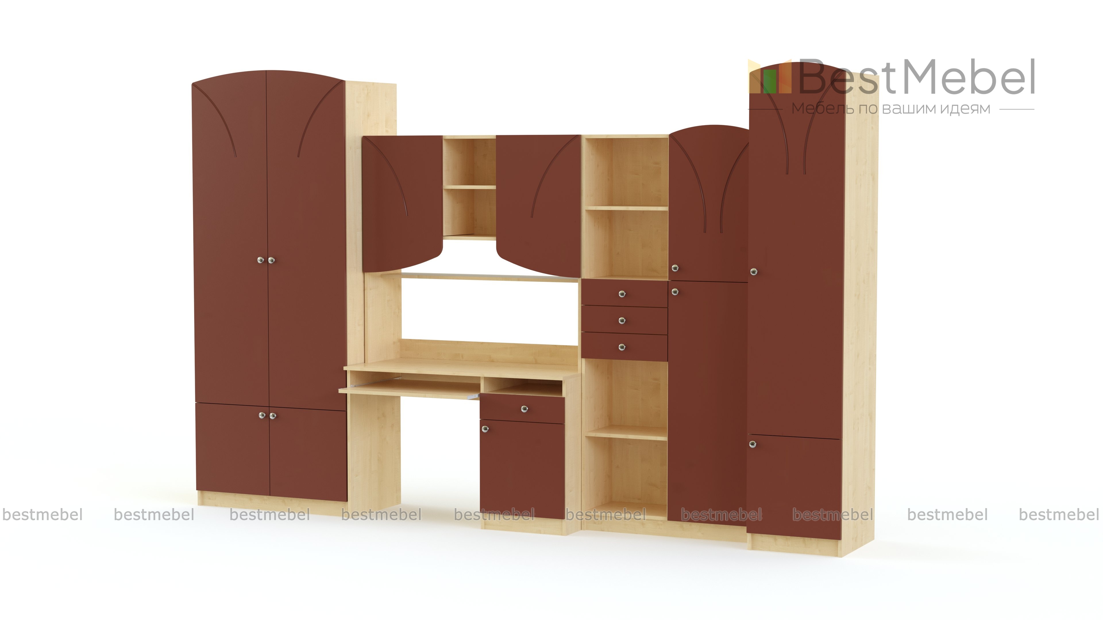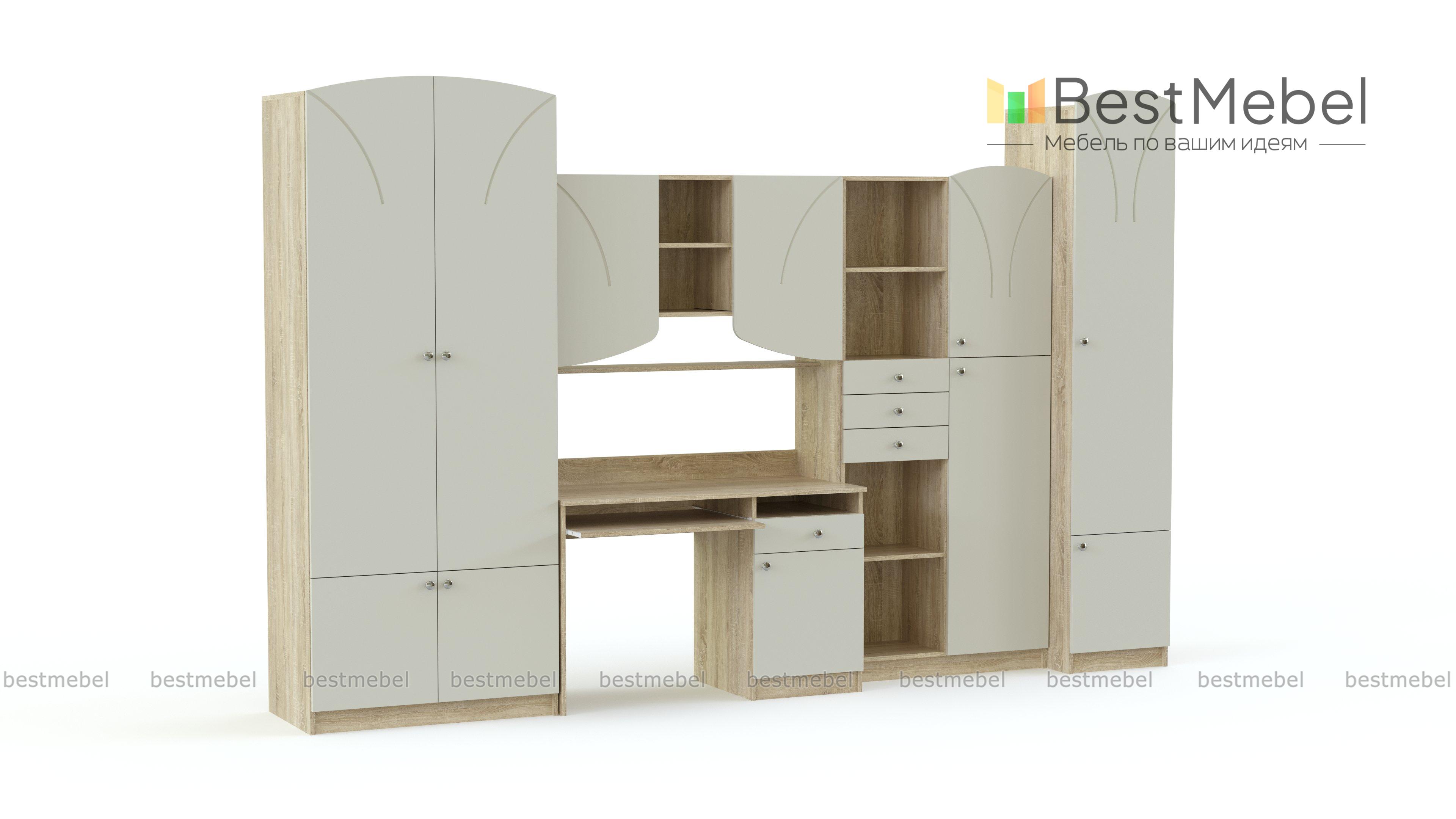 Детская комната Румба BMS – это гармоничное сочетание классического декора и современной функциональности, особенно актуальной для подростковых комнат. Для комфортной учебы и удобного размещения гардероба, книг, техники и мелочей комплект оборудован компьютерным столом с тумбой и надстройкой, распашным шкафом, комбинированным стеллажом и пеналом. Все предметы выполнены в теплых древесных оттенках и украшены фрезеровкой. Купить детскую комнату Румба BMS приглашаем в наш интернет-магазин.