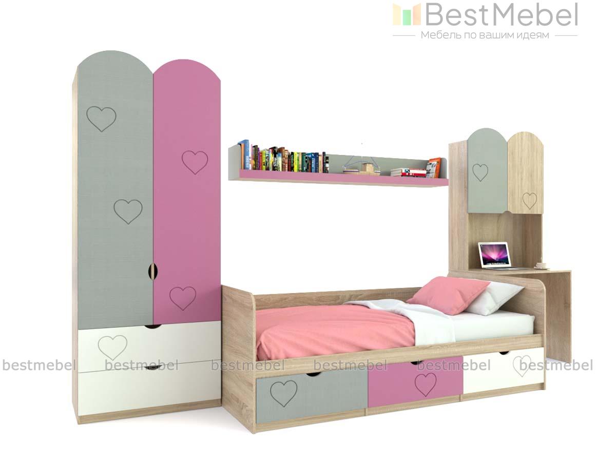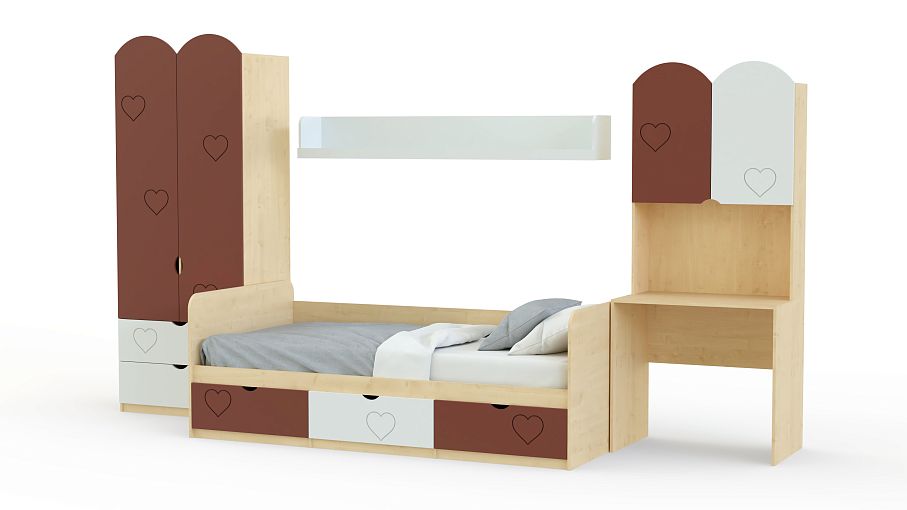 Детская комната Сказка 21 BMS оборудована всем самым необходимым для комфортного отдыха, учебы и хранения вещей ребенка. В комплекте кровать с тремя выдвижными ящиками для постельного белья или игрушек в основании, платяной шкаф и компьютерный стол с надстройкой в виде распашного шкафчика. Корпус древесного оттенка дополняют фасады в терракотовом цвете, украшенные фрезеровкой, дверцы фигурно вырезаны. Купить детскую комнату Сказка 21 BMS приглашаем в наш интернет-магазин.