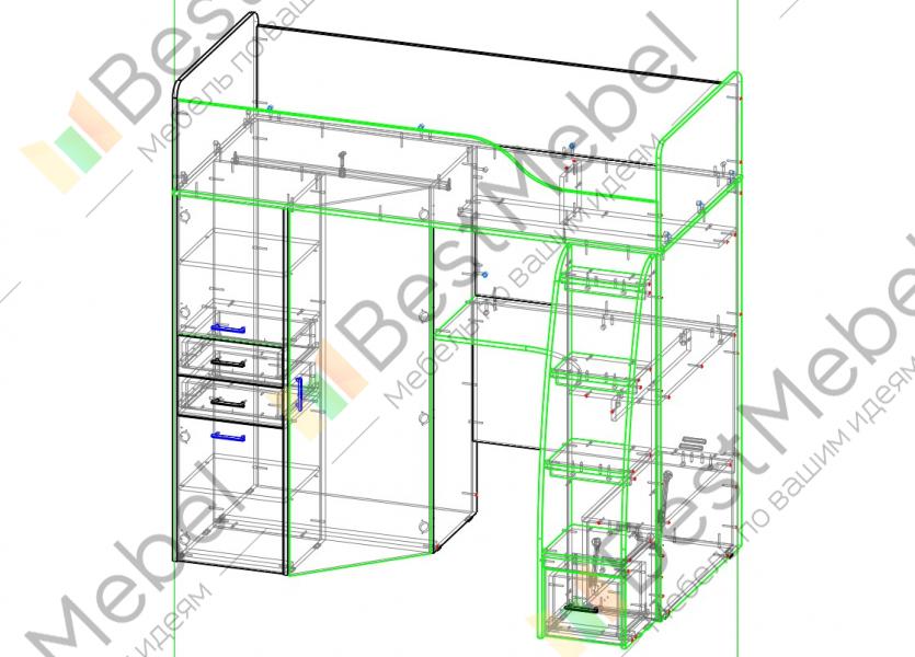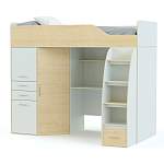 Великолепная детская кровать-чердак Дм76 BMS сэкономит площадь в комнате ребенка и ваш бюджет! Не нужно покупать дополнительную мебель – модель организует спальное место, рабочую зону и множество вариантов хранения вещей. Всё в одной композиции! Постель оборудована защитными бортами, находится на верхнем ярусе, забраться куда рекомендуем по лестнице. Нижняя ступенька – полноценный ящик. Под основанием удачно вписаны стол, полки. Распашной шкаф и конструкция из выдвижных отделений предназначена для одежды, текстиля. Двухцветная комбинация оттенков ЛДСП выглядит свежо и привлекательно.