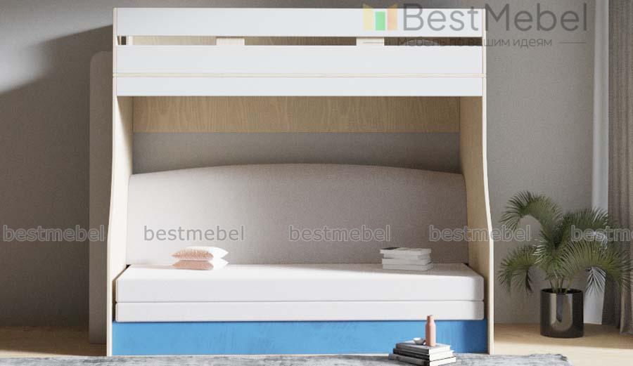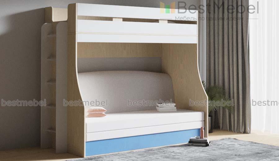 Детская кровать с диваном Шайн 2C BMS – это двухъярусная модель с корпусом светлых древесных тонов и цветным пастельным фасадом. Компактная и лаконичная, композиция сэкономит пространство небольших комнат. Просторное спальное место с бортиком располагается на втором ярусе, а первый оборудован нишей с раскладным диваном. С торца закреплена вертикальная лестница с металлическими перекладинами. Купить детскую кровать с диваном Шайн 2C BMS приглашаем в наш интернет-магазин, подобрав нужные параметры.