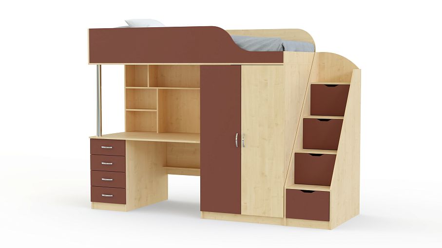 Кровать-чердак с рабочей зоной Мираж К7-4 BMS гармонично впишется в интерьер современной детской и поможет оборудовать всем необходимым даже небольшую комнату. Композиция состоит из расположенной на втором ярусе кровати с защитным бортиком, встроенного распашного шкафа для одежды, рабочей зоны со столом, тумбой и книжными полками, а также устойчивой и практичной лестницы-комода. Корпус светлых древесных тонов дополняют цветные фасады. Купить кровать-чердак с рабочей зоной Мираж К7-4 BMS приглашаем в наш интернет-магазин.