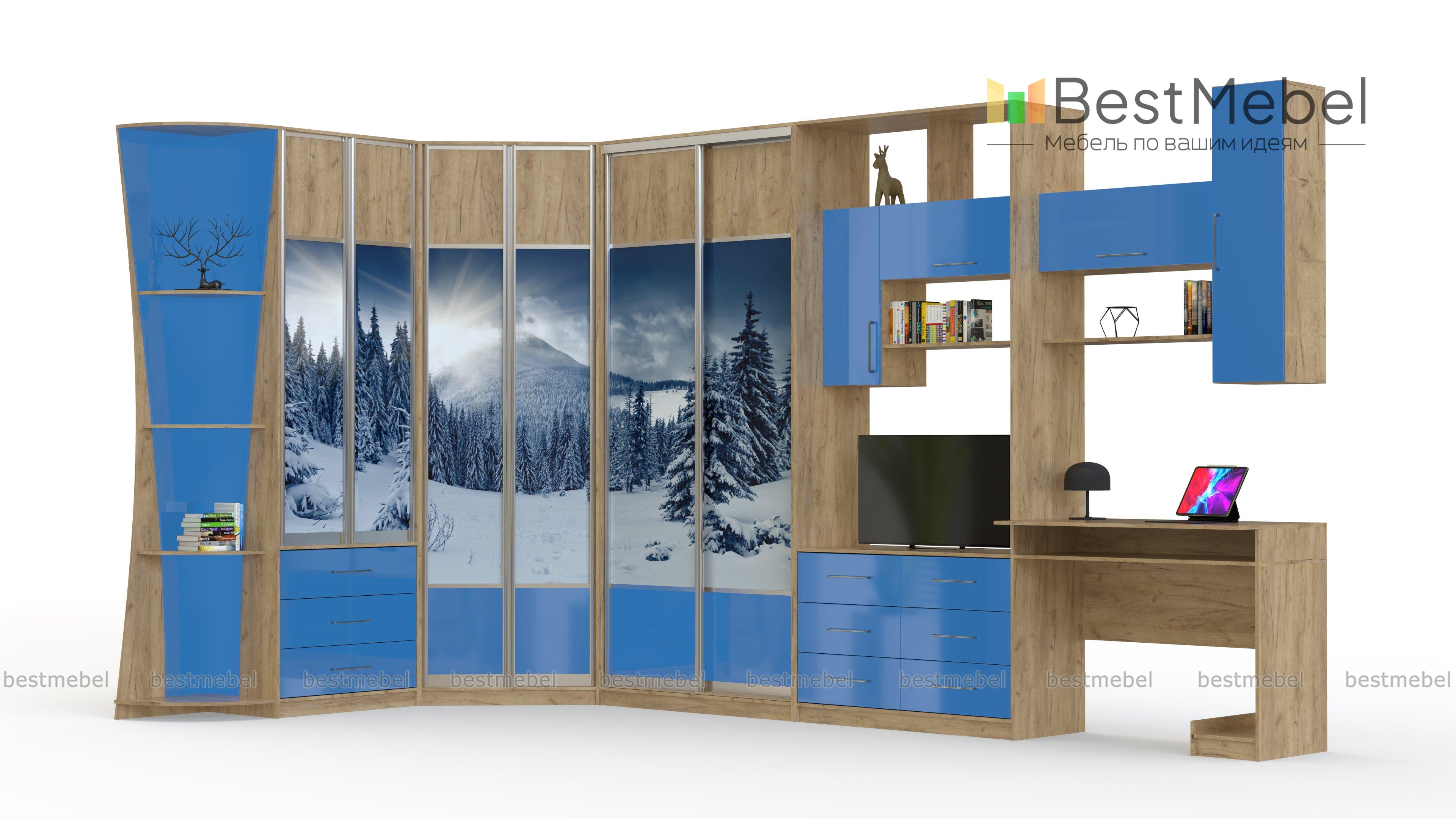 Шкаф-купе угловой с нишей и столом Зима BMS – это многофункциональная модель, объединившая удобную систему хранения, зону размещения ТВ и рабочее место. Практичное решение для просторной молодежной комнаты, композиция включает в себя угловой и два прямых шкафа-купе, торцевой стеллаж, тумбу с выдвижными ящиками, навесные распашные шкафчики и компьютерный стол. Ярким акцентом в интерьере станет фасад, декорированный фотопечатью с изображением зимнего леса. Купить шкаф-купе угловой с нишей и столом Зима BMS приглашаем в наш интернет-магазин.