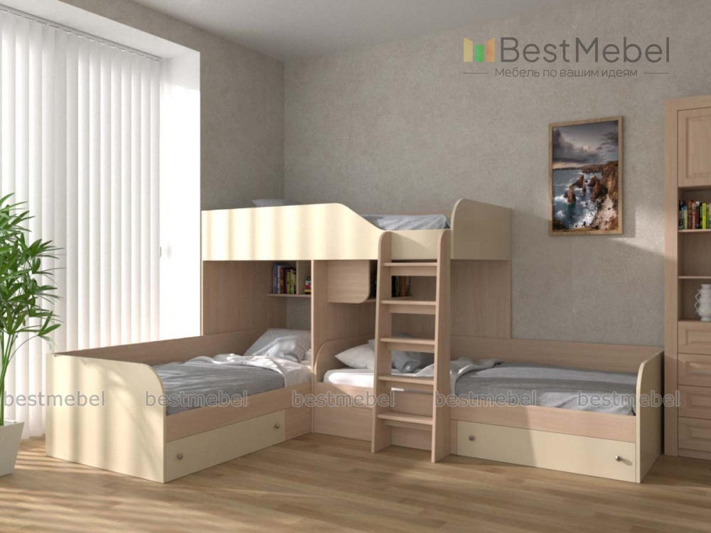 У нас в одной комнате растут трое мальчиков. Эта кровать оказалась единственным удобным вариантом, как разместить три "взрослых" спальных места, чтобы при этом осталось место для игр и учебы.Действительно быстрое и качественное изготовление, бесплатная доставка, да еще и бонусом получили бесплатную полочку, отлично вписавшуюся в интерьер.Спасибо конструкторам и производителям!