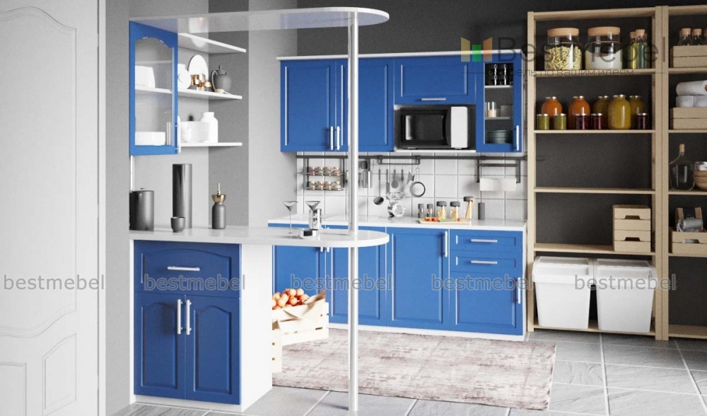 Кухня Невил-12 BMS – практичное решение для помещений нестандартной планировки. Комплект современного дизайна помимо прямых напольных и навесных элементов включает в себя угловую композицию с барной стойкой. Скругленная просторная столешница удобна для готовки или быстрого перекуса, а разместить напитки, специи, посуду и кухонные аксессуары помогут тумба с выдвижным ящиком и распашным отделением, навесная витрина и стеклополки. К хромированной опоре крепятся фруктовница и бокалодержатель. Купить кухню Невил-12 BMS вы сможете в нашем интернет-магазине, подобрав цветовое решение.