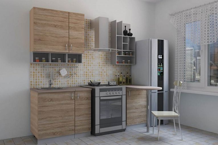 Небольшой лаконичный гарнитур Тоскана 1 BMS – отличный выход для малогабаритных кухонь, загородных домов и студий. Три напольных и три навесных модуля при всей компактности обладают достаточной вместительностью для размещения мойки, посуды, столовых приборов и прочих принадлежностей. Фасады выполнены в спокойном бежевом оттенке под массив дерева и легко вписываются в интерьер. Одно из достоинств этой кухни – доступная в нашем интернет-магазине цена.