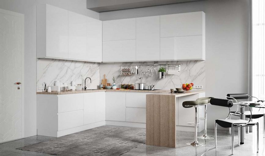 Кухня Виктория Глянец BMS поможет создать эффектный интерьер в стиле минимализм или хай-тек. П-образный гарнитур с приставной барной стойкой и высокими навесными шкафами по максимуму использует доступное пространство и удобен для зонирования. Белые глянцевые фасады вертикальных и горизонтальных секций гармонично сочетаются со столешницами в теплых тонах под массив дерева. Купить кухню Виктория Глянец BMS приглашаем в наш интернет-магазин, подобрав оптимальные характеристики.