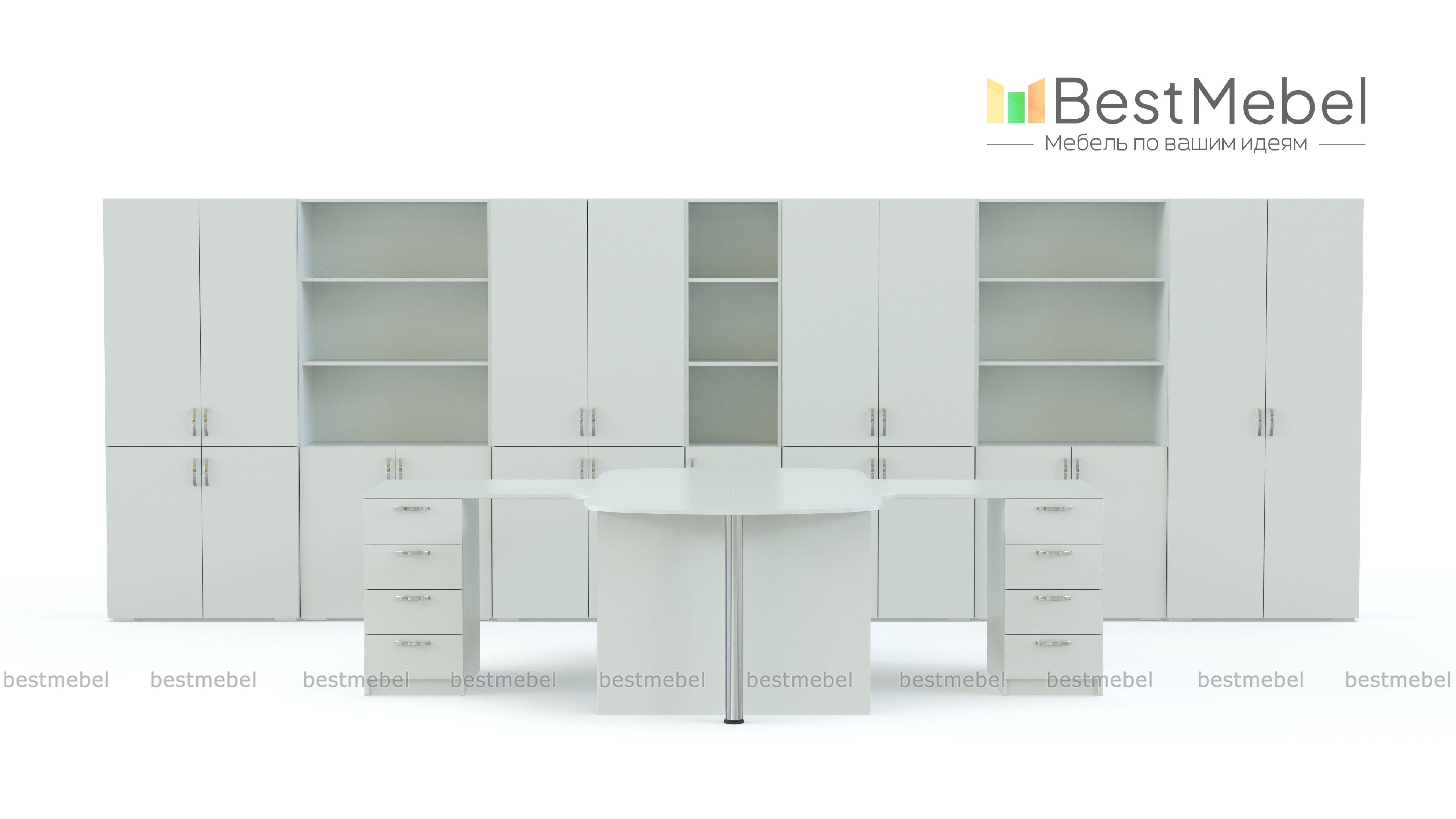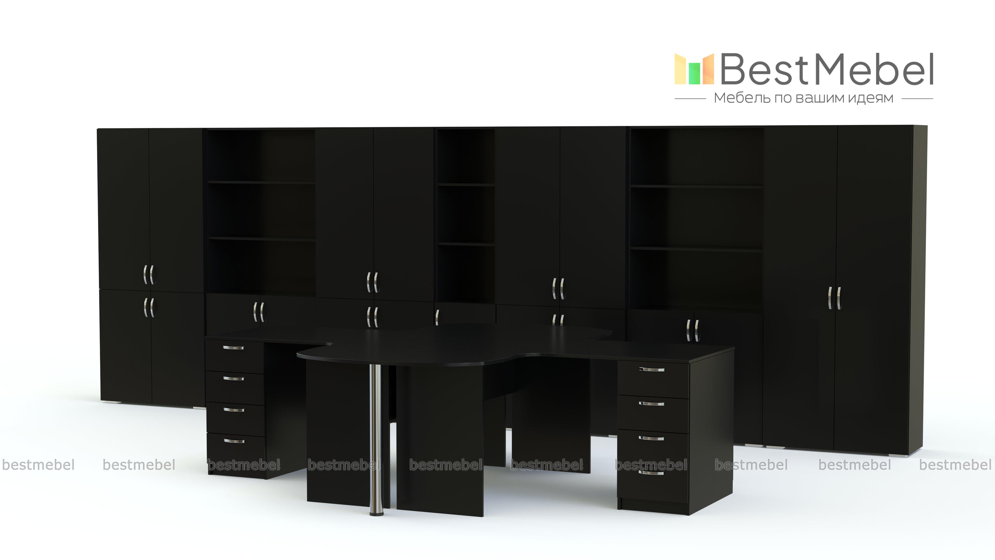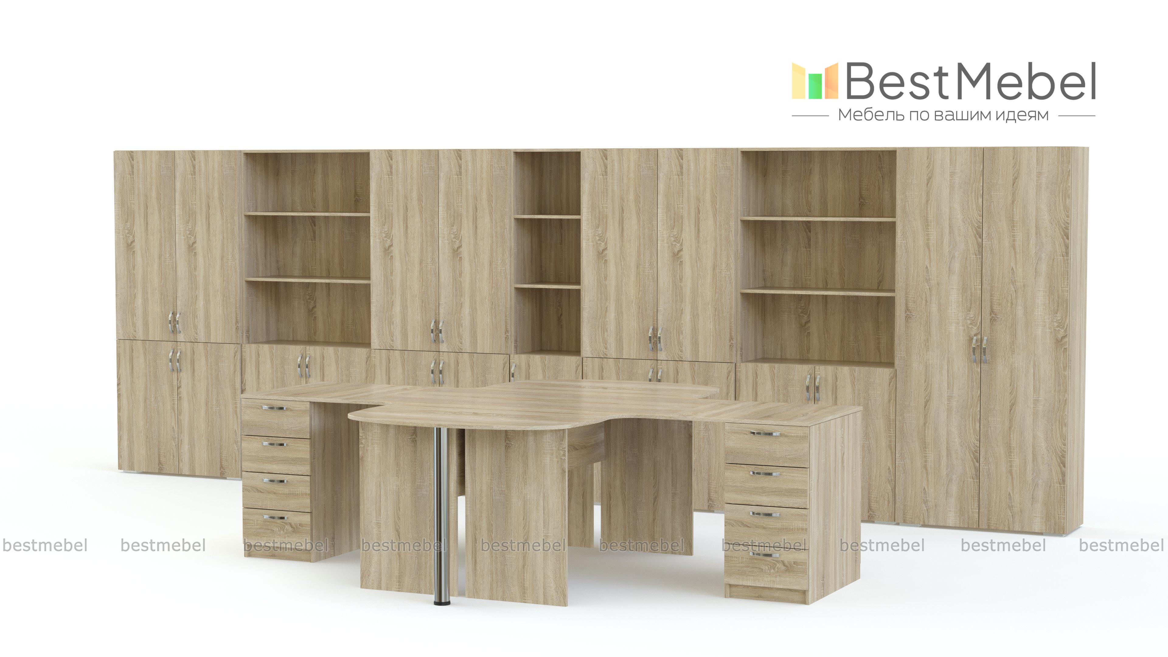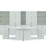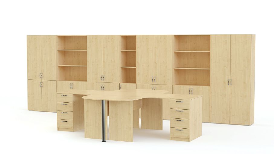 Компактный офисный комплект, где удобно разместятся сразу 4 человека. Здесь без проблем можно организовать рабочее место с персональным компьютером, ящиками для хранения документов каждого работника. Кроме того, в комплект входят стеллажи и шкафы для папок, канцелярии, книг и одежды.