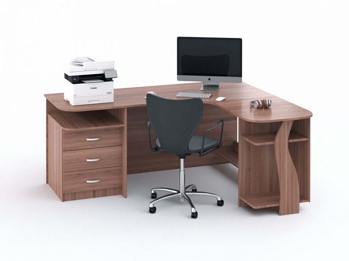 Стол офисный угловой Кейт 23 BMS отличается функциональностью и оригинальным дизайном. Современная модель позволит эффективно использовать пространство и оборудована широкой столешницей, на которой разместятся монитор, письменные принадлежности и оргтехника, полочкой для клавиатуры, нишей под системный блок и тумбой с выдвижными ящиками. Выполненный в теплых древесных тонах, стол безопасно скруглен по углам и декорирован фигурно вырезанным элементом. Купить стол офисный угловой Кейт 23 BMS приглашаем в наш интернет-магазин.