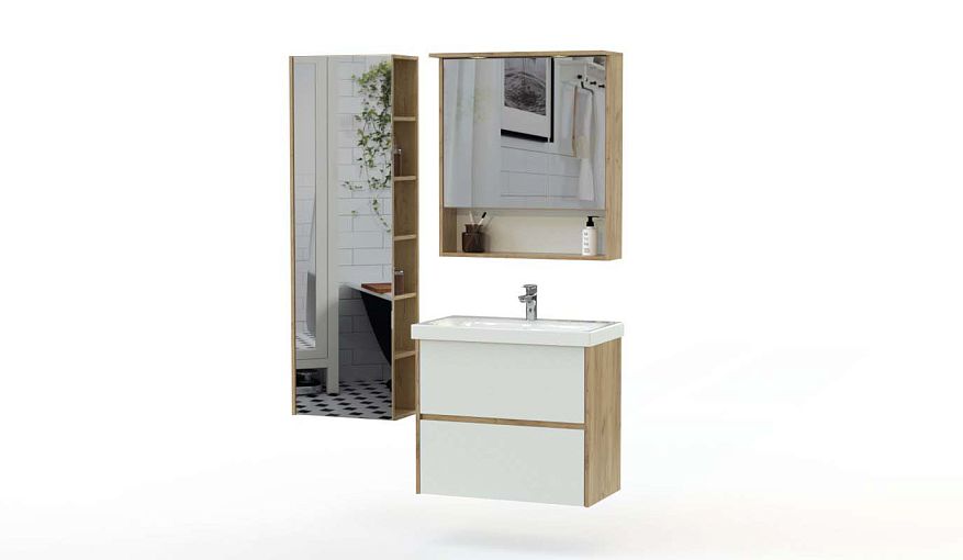 Комплект для ванной Лестер 1 BMS поможет создать актуальный интерьер с элементами стиля лофт или модерн. Композиция включает в себя тумбу под раковину, навесной зеркальный шкаф с нишей для хранения мелочей и пенал, дополненный открытыми торцевыми полками. В оформлении модулей скомбинированы темные древесные тона, зеркала и красный глянец. Купить комплект для ванной Лестер 1 BMS и создать комфортное, эргономичное пространство вы сможете с помощью нашего интернет-магазина.