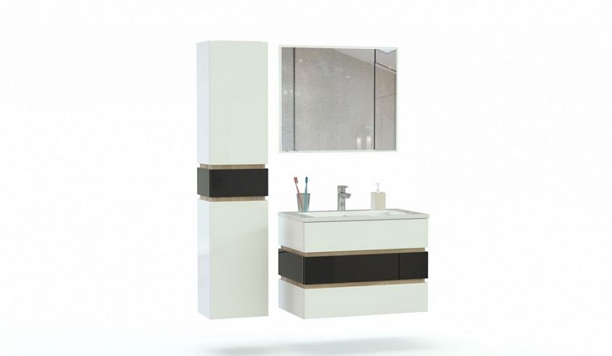 Мебель для ванной Шелти 5 BMS – это оригинальный геометричный дизайн, функциональность и долговечность. Подвесная композиция включает в себя тумбу под раковину с выдвижными ящиками, комбинированный с ящиком пенал и большое прямоугольное зеркало. В оформлении предметов эффектно сочетаются древесные тона, белый и черный глянец, боковины декорированы контрастными накладками. Купить мебель для ванной Шелти 5 BMS вы сможете в нашем интернет-магазине с учетом необходимых размеров.