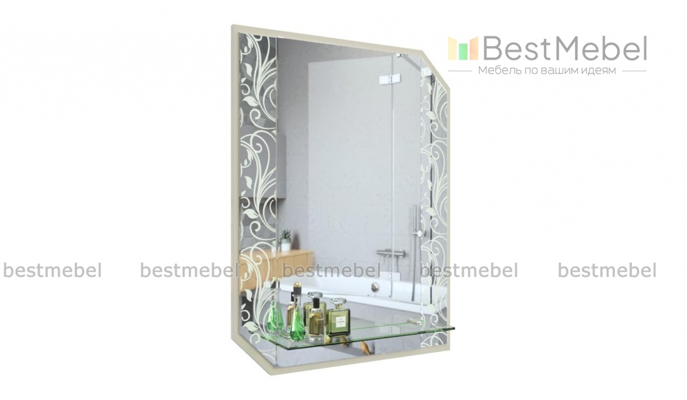 Зеркало в ванную комнату Дуо 3 BMS декорировано фацетом и эффектно сочетает в оформлении классическое и тонированное зеркальное полотно с изящным пескоструйным рисунком. Подвесная модель без рамы со скошенными углами смотрится особенно легкой и визуально расширяет границы небольшого помещения. Для удобного хранения мелочей конструкцией предусмотрены две открытые полочки – большая и малая. Купить зеркало в ванную комнату Дуо 3 BMS по выгодной цене приглашаем к нам в интернет-магазин.