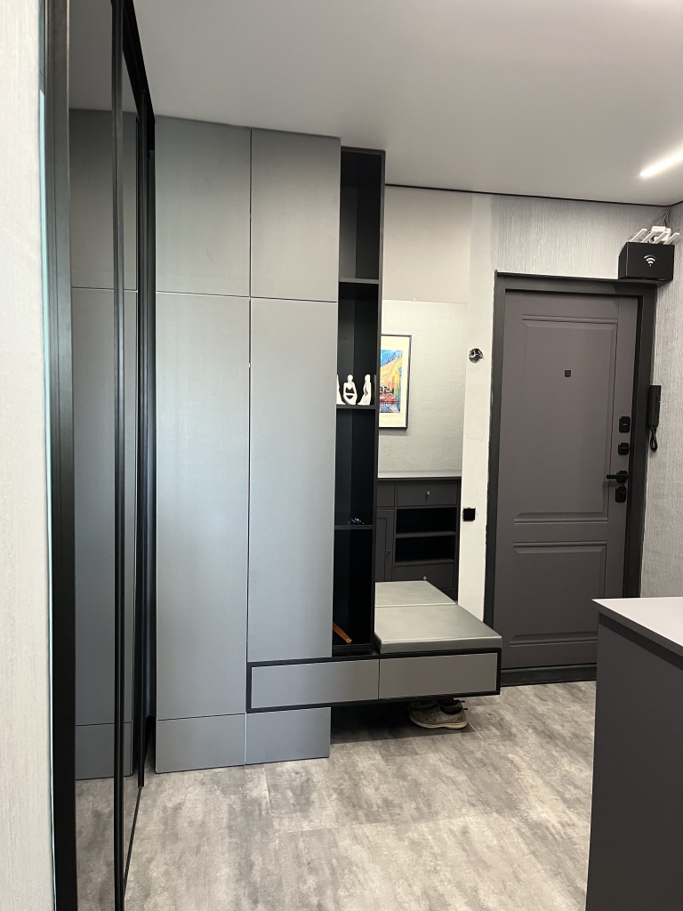 Прихожая Нелли 15 BMS изготовлена из ламинированной плиты нейтрального оттенка, а теплый цветовой акцент создает древесная фактура. Современная композиция предусматривает не только закрытые распашные отделения и ящики для одежды и обуви, но и эффектный книжный стеллаж, подсвеченный светодиодами. Незаменимое в интерьере прихожей большое зеркало придает конструкции легкость. Купить прихожую Нелли 15 BMS с выбором цвета и размеров вы сможете в нашем интернет-магазине.