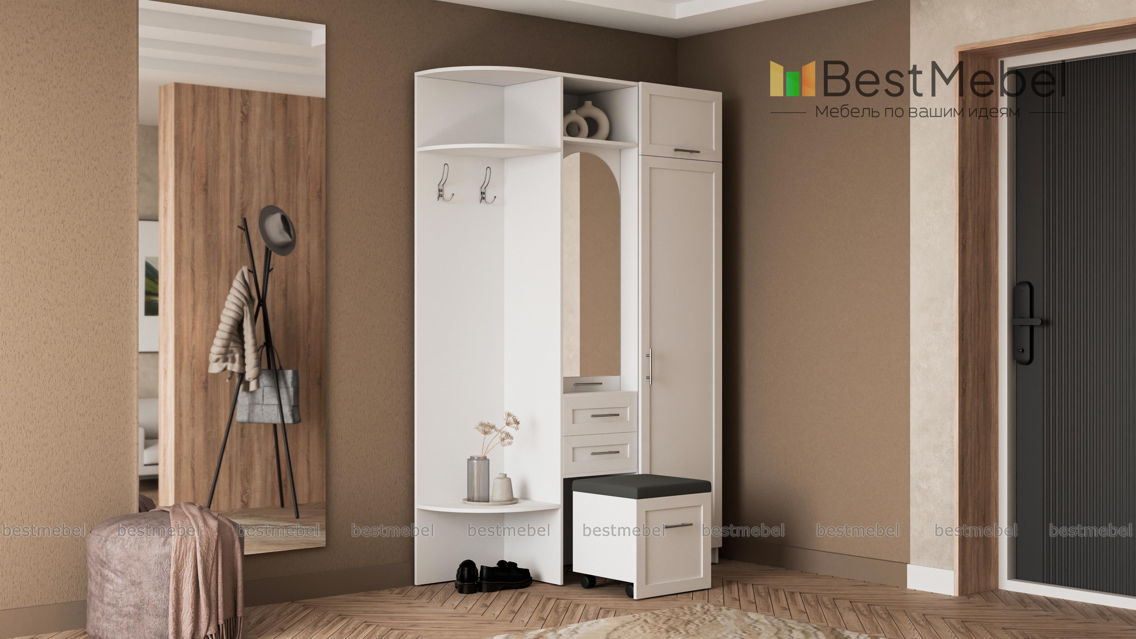Прихожая Вика 1Б BMS с выкатным пуфом в мягкой обивке позволяет эффективно использовать пространство. Классическая композиция объединила пенал для одежды и антресоль, открытую вешалку со скругленными полками и большое, расположенное в нише зеркало, дополненное парой выдвижных ящиков. Широкие рамки на фасадах насыщенного древесного оттенка играют роль декора. Купить прихожую Вика 1Б BMS приглашаем в наш интернет-магазин с выбором фурнитуры и цвета по каталогу.
