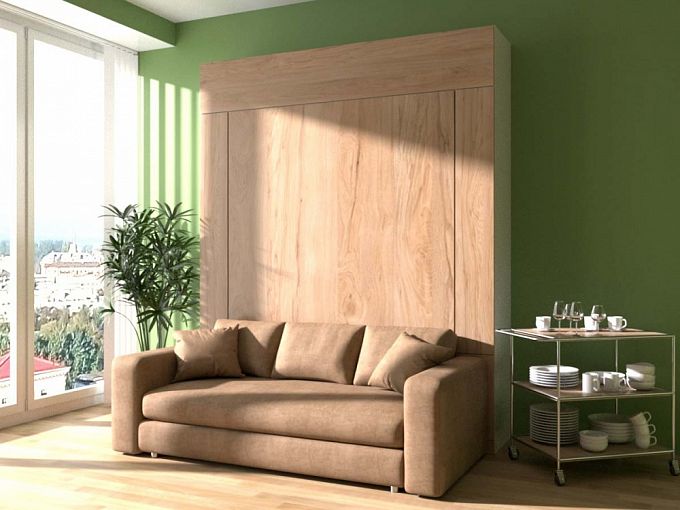 Сделал заказ в середине ноября. Очень долго делали, что то постоянно не было на производстве, то нужного цвета, то ткани. В итоге заказ пришёл через 2,5 месяца в начале февраля. Приехал в полной комплектации, кроме понижающего трансформатора, который по рекламации подвезли позже, через неделю, но на сборку это не влияло. Сам шкаф удобный,внутри при раскинутой кровати есть полки под разные мелочи и шкафчики. Я сделал проводку к каждой стороне и вывел розетки и светильники, очень функционально, можно ставить телефоны на зарядку, что бы под боком были. Верхние ящики-антресоли вмещают подушки и пледы, но так как у нас высота потолков не позволяла заказать в полную высоту, то газлифты на дверцы установить не подразумевалось конструкцией (о чём меня предупреждали ещё в наале заказа), и это кстати весьма неудобно, т.к. нужно иметь третью руку, что бы держать крышку, а двумя руками засовывать подушки..Ещё подъёмные газлифты самого корпуса кровати, а именно кронштейны, не вызывают доверия. Но тут как говорится за ваши деньги любой каприз. Я выбрал по умолчанию дешёвые. Есть получше. Советую брать их. Текущие довольно упругие, на подъём тяжеловатые, но жена справляется. Самое непродуманное это большой объём подушек от дивана, которые приходится складировать куда то рядом. Это проблема. У меня есть мысль как заколхозить это, но хотелось бы видеть решение от производителя. В целом я доволен шкафом-кроватью. Кровать была моей мечтой. Потому что две большие комнаты мы отдали детям, там у них творческие мастерские, музыкальные инструменты, а себе оставили маленькую комнатушку 9 кв.метров. И всё время спали на раскладном диване. По этому, когда я увидел эту кровать и её размеры, то я конечно загорелся идеей разместить её в этой комнате. И у меня получилось!