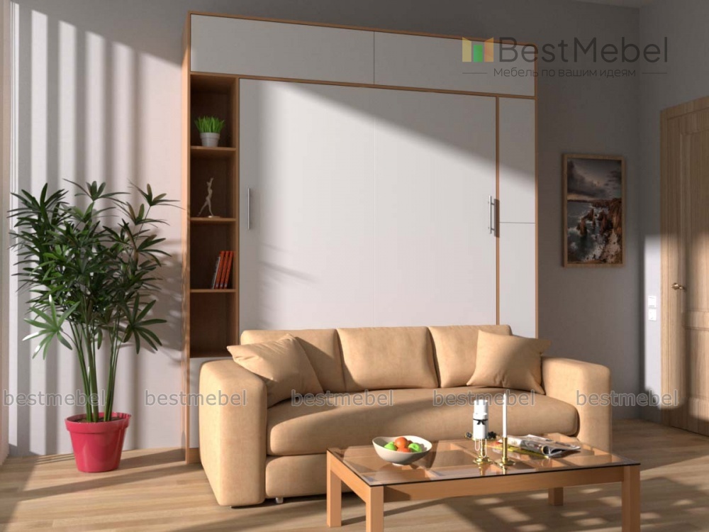 Шкаф-кровать с диваном Верона BMS поможет создать комфортный и функциональный интерьер в стиле минимализм или скандинавском. Композиция объединила шкаф с антресолью, открытыми и глухими распашными полками, уютный диван в обивке из рогожки и скрытую за имитацией дверей раскладную двуспальную кровать. В нише располагаются незаменимые в вечернее время встроенные светодиодные светильники. Купить шкаф-кровать с диваном Верона BMS приглашаем в наш интернет-магазин, подобрав оптимальное цветовое решение.