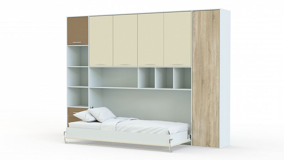 Мы не рекомендуем покупать пружинные матрасы к шкафу-кровати. Стоит отдавать предпочтение беспружинным изделиям. Это связано с тем, что поведение пружин в вертикальном положении матраса невозможно предсказать. Матрас быстро подвергается деформации и смещению слоев. Идеальным вариантом для откидной модели будет лёгкий беспружинный матрас, основу которого составляют современные материалы, не имеющие в составе пружины.