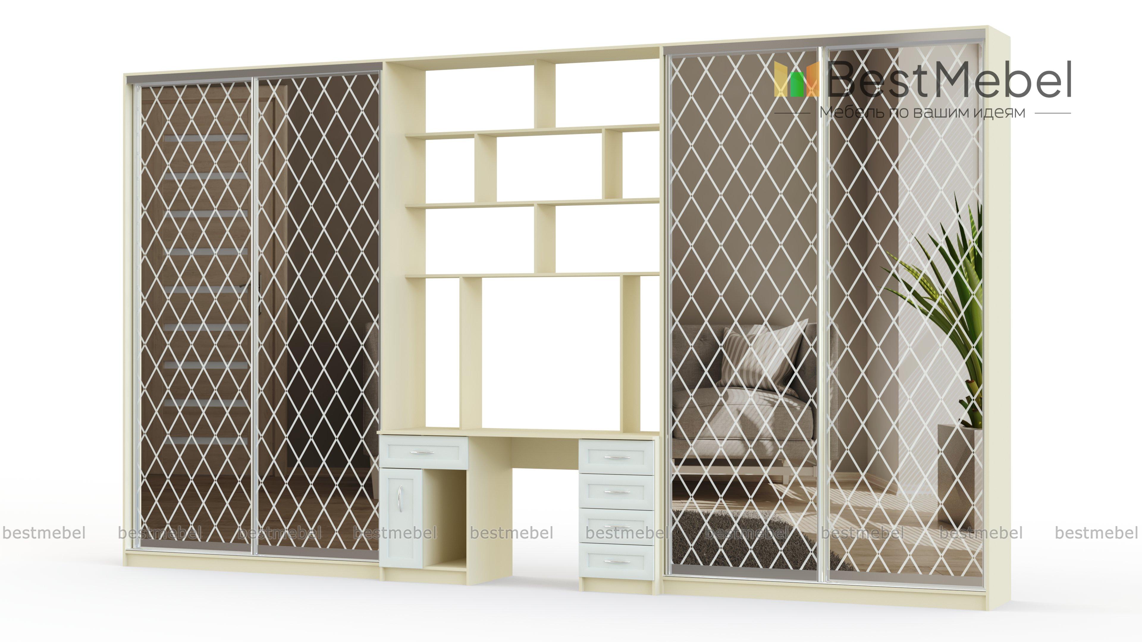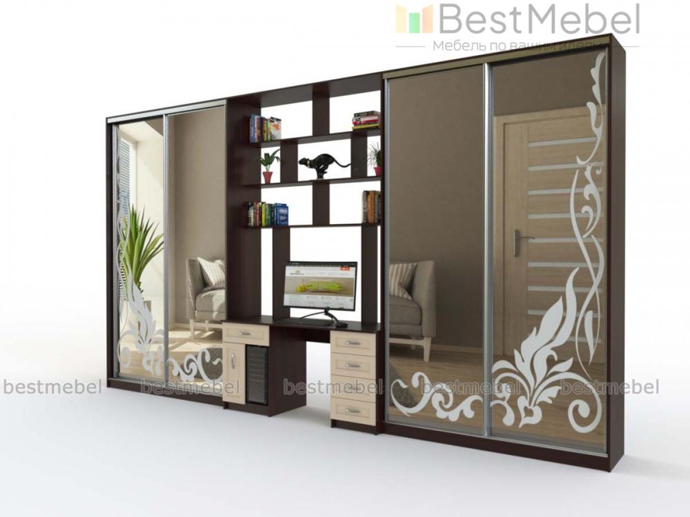 Двойной шкаф-купе Нео 44 BMS станет украшением интерьера просторной гостиной. Комбинированная модель объединила два двухдверных шкафа-купе с полками и штангами, рабочий стол, оборудованный двумя тумбами, и открытые книжные полки. Выполненная в темном оттенке венге, композиция смотрится элегантно с зеркальными фасадами, декорированными фантазийным пескоструйным рисунком. Купить двойной шкаф-купе Нео 44 BMS и эффективно использовать доступное пространство вам поможет наш интернет-магазин.