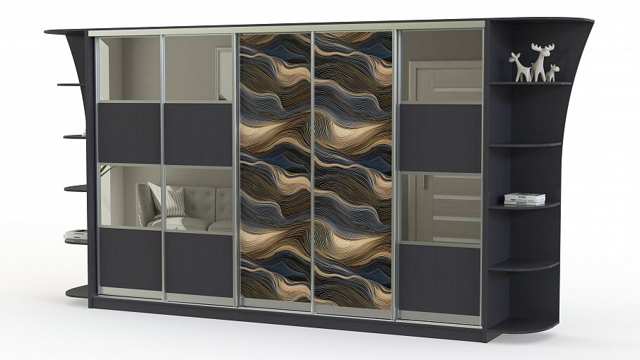 Шкаф-купе Аура 22 BMS выполнен в глубоком темном оттенке из ламинированной ДСП, а абстрактный рисунок придает дизайну особую атмосферность. Две створки с принтом дополнены тремя украшенными зеркальными вставками, визуально облегчая крупногабаритную, массивную конструкцию. Завершенный вид шкафу придают фигурные торцевые стеллажи, на которых выигрышно смотрятся книги и интерьерные аксессуары. Купить шкаф-купе Аура 22 BMS в спальню или гостиную можно на сайте нашего интернет-магазина.