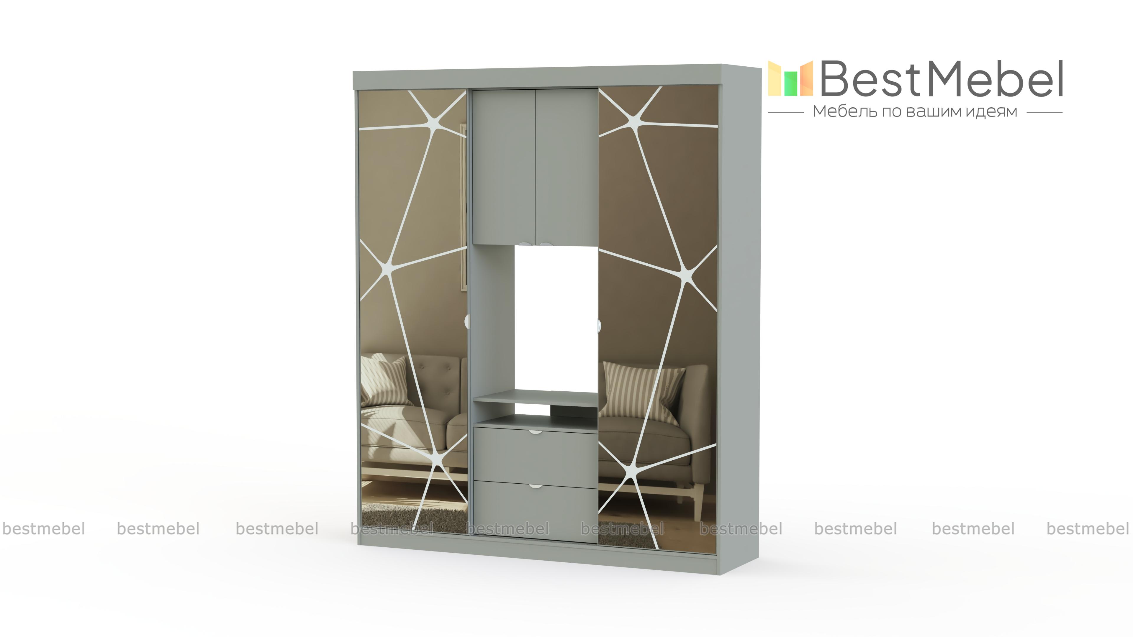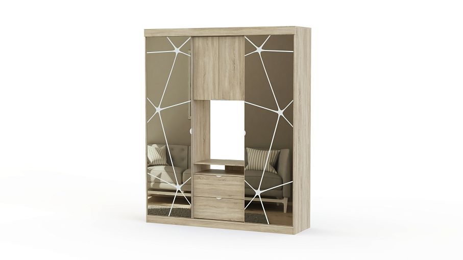 Шкаф-купе Карго – это стильная и оригинальная корпусная мебель для Вашего дома. В фасаде изделия сочетается ламинированное ДСП с фактурой дерева и зеркальные двери. Оригинальный рисунок создает иллюзию разбитого стекла. Такое изделие станет заметным элементом интерьера дома, притягивая взгляды Ваших гостей. Конструкция шкафа-купе – это просто маленький мир для всех Ваших вещей. Здесь найдется место не только для одежды и обуви, но и продуман отдел, где удобно разместится телевизор и другая техника. Это отличный вариант для небольшой квартиры, которую не хочется загромождать корпусной мебелью, оставив для своей семьи как можно больше пространства.