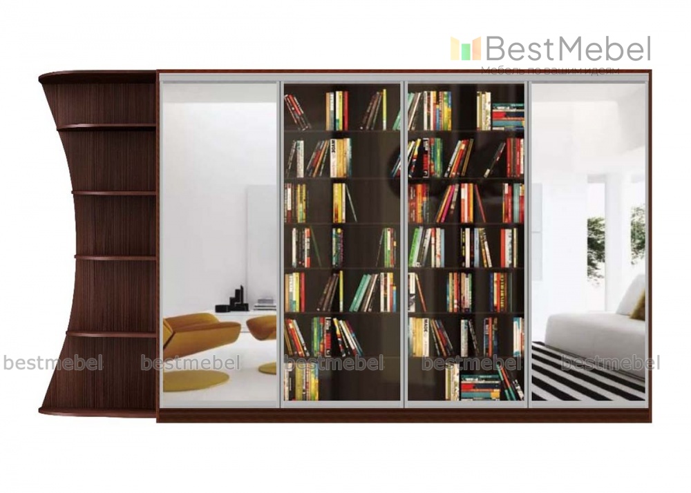 Шкаф-купе Мюррей 1.12 BMS – это удобная система хранения для современной гостиной, объединившая функции книжного шкафа и платяного. Четырехдверная модель оборудована расположенными в центре застекленными полками для эффектного размещения книг и боковыми глухими секциями с зеркальными фасадами. Фигурно вырезанный торцевой стеллаж выигрышно представит на открытых полках предметы декора. Купить Шкаф-купе Мюррей 1.12 BMS и рационально организовать пространство вам всегда поможет наш интернет-магазин.