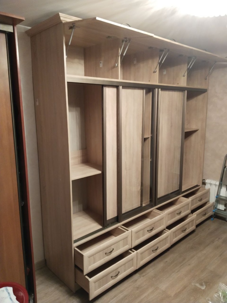 Шкаф вместительный, красивый. Собирали самостоятельно около недели, работы было много. Все отверстия были разделены точно. Немного пришлось подпиливать направляющие для системы купе, так как ширина шкафа всборе оказалась чуть меньше длины направляющих. Дверцы верхних полок на газлифтах, так что убирать и доставать вещи можно только со стремянки. Из недостатков: на панелях имеются сколы, пришлось подкрашивать; направляющие под систему купе изначально не привезли, ждали довоз в течении 10 дней; по низу нет регулировки, обычные пятки; тяжело дозвониться, но всегда перезванивают; слепая схема изделия, нет инструкции по сборки. Схемы изделия с номерами позиций выполненные с разных ракурсов можно запросить в гарантийном отделе, скинут по электронной почте.