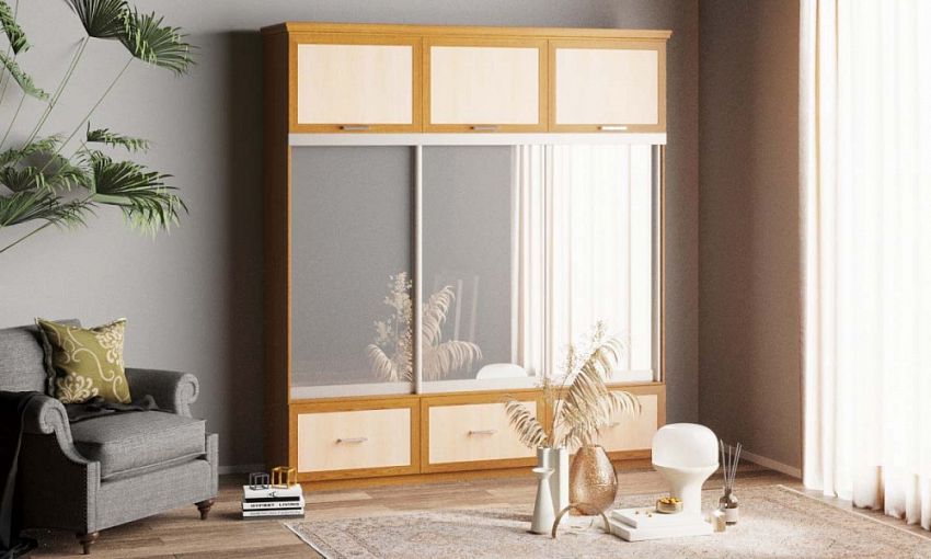 Шкаф-купе Нэмо 8 BMS имеет практичную комбинированную конструкцию, позволяющую разместить предметы гардероба, домашний текстиль и сезонные вещи. В основании шкафа располагаются три просторных выдвижных ящика, центральная часть представляет собой отделение-купе с полками и штангой, а верхняя – антресоль с глухими дверцами. Классические рамочные фасады дополнены полностью зеркальными створками, которые придают помещению глубину. Купить шкаф-купе Нэмо 8 BMS приглашаем выгодно в наш интернет-магазин.