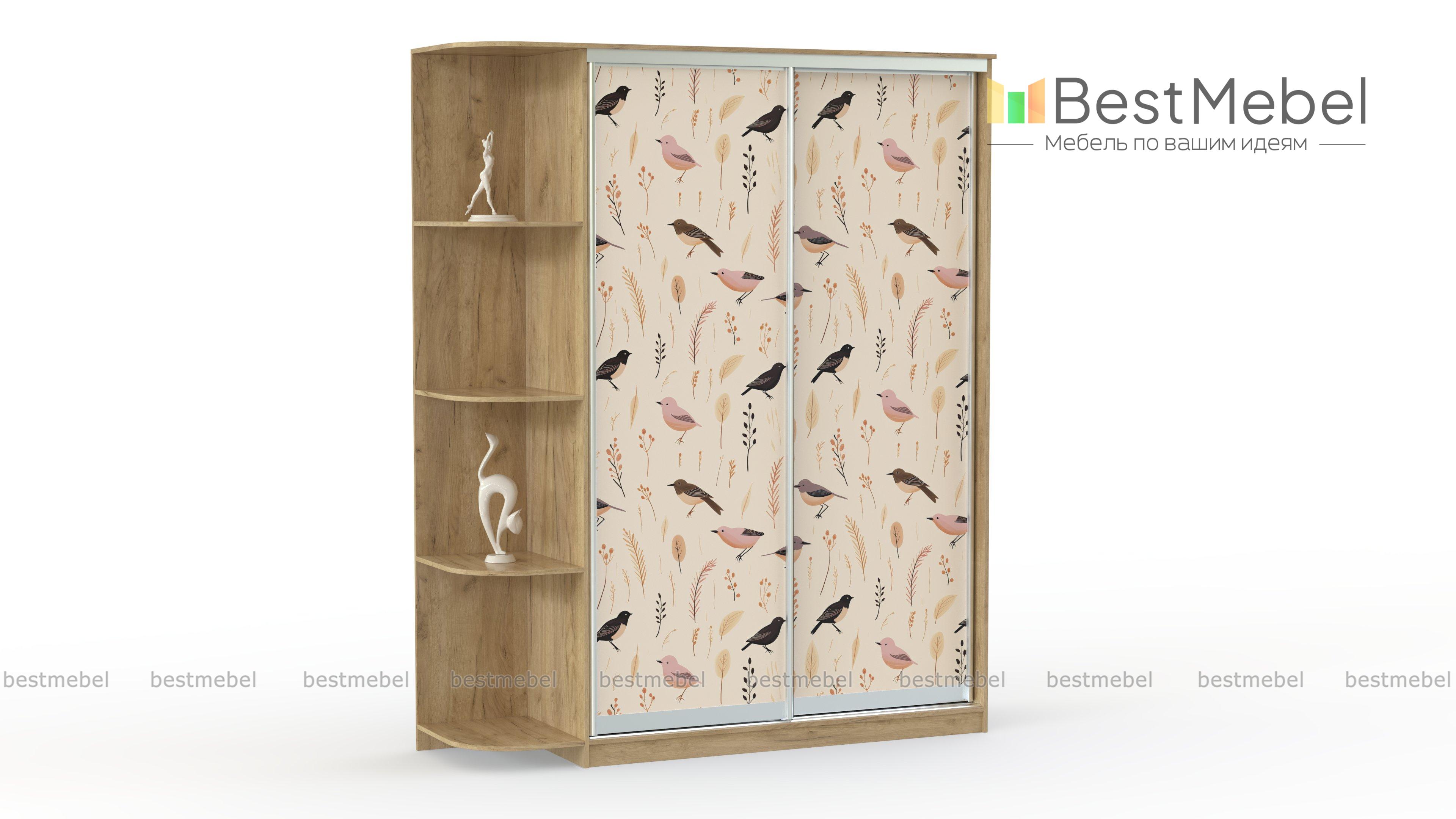 Шкаф-купе sk-087 BMS имеет комбинированную конструкцию и современный дизайн. Натуральный древесный оттенок корпуса, птицы и растения на фасаде создают по-домашнему уютную атмосферу. Двухдверное платяное отделение предназначено для хранения одежды, а полезные мелочи, любимые книги и интерьерные украшения можно разместить на полках скругленного торцевого стеллажа. Купить шкаф-купе sk-087 BMS приглашаем в наш интернет-магазин с выбором нужных размеров и цвета по каталогу.