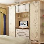 В спальне главным элементом, несомненно, является кровать, но не обойтись в ней без системы хранения постельного белья, предметов одежды, различных домашних вещей. Шкаф купе TV-10 BMS создан как раз для подобных целей. Выдвижные ящики удобно использовать для хранения постельных принадлежностей, в просторных одежных отсеках можно разместить весь гардероб. Модель имеет в своем составе антресоли, милые закругленные полочки из прозрачного стекла. В нише можно расположить большой плазменный телевизор, чтобы посмотреть перед сном любимую передачу. Украшают модель светлый оттенок корпуса с нежным замысловатым рисунком по фасаду дверей, модная фурнитура и подсветка, которая создаст в помещении соответствующую атмосферу покоя и домашнего уюта.
