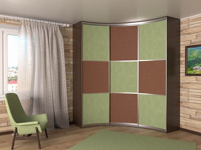 Шкаф-купе радиусный Родион 3 BMS – это эффектная трехдверная модель для просторной спальни. Крупногабаритная конструкция не смотрится громоздко благодаря угловой конструкции и необычной формы вогнутому фасаду. Продумав внутреннее наполнение, вы сможете компактно разместить большое количество вещей и сэкономить на лишней мебели. Раздвижные дверцы шкафа декорированы расположенными в шахматном порядке вставками шоколадного цвета и яркими вставками зеленого оттенка. Купить шкаф-купе радиусный Родион 3 BMS по отличной цене приглашаем на сайт нашего интернет-магазина.