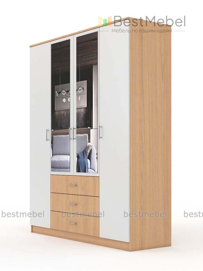 В стандартной комплектации шкаф имеет 1 платяное отделение по центру (полка для шляп и штанга), 2 бельевых отделения с 4-мя полками + 3 выдвижных ящика. Возможно изменение внутреннего наполнения