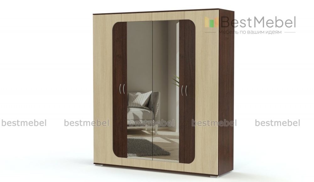 Распашной шкаф Пальмира BMS выполнен в контрастных древесных тонах из ЛДСП высокого качества. Четырехдверная модель отличается вместительностью и позволяет хранить в быстром доступе необходимые предметы гардероба и постельные принадлежности. Фасад оригинального геометричного дизайна со скругленным вырезом дополнен ростовыми зеркалами, удобными для примерки и придающими комнате дополнительную глубину. Купить распашной шкаф Пальмира BMS вы сможете в нашем интернет-магазине с выбором фурнитуры и цвета по каталогу.