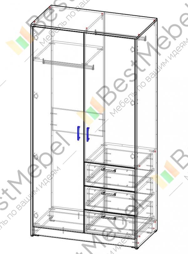 В данной модели продумано абсолютно все для Вашего комфорта. В конструкцию шкафа 2-х дверного с ящиками Мика BMS входит платяной отсек со штангой для вешалок, отделение с полками для немнущихся вещей, верхняя полка для головных уборов или коробок с сезонными вещами и обувью, а также три выдвижных ящика. Купить шкаф 2-х дверный с ящиками Мика BMS стоит в квартиру или дом с современным интерьером.