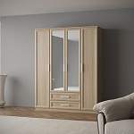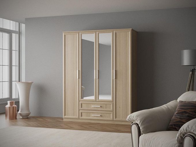 Данная модель вполне удовлетворит большую семью, поскольку вместительностью превышает другие подобные изделия. Распашной шкаф имеет четыре отделения, два центральных – с большими зеркалами на дверях, для верхней одежды, и два боковых с полками для белья и постельных принадлежностей. Два выдвижных ящика под средними отделениями значительно увеличивают емкость шкафа. Заказать 4-х дверный шкаф с зеркалами Юлианна Вы можете на нашем сайте, выбрав подходящую окраску и размеры.