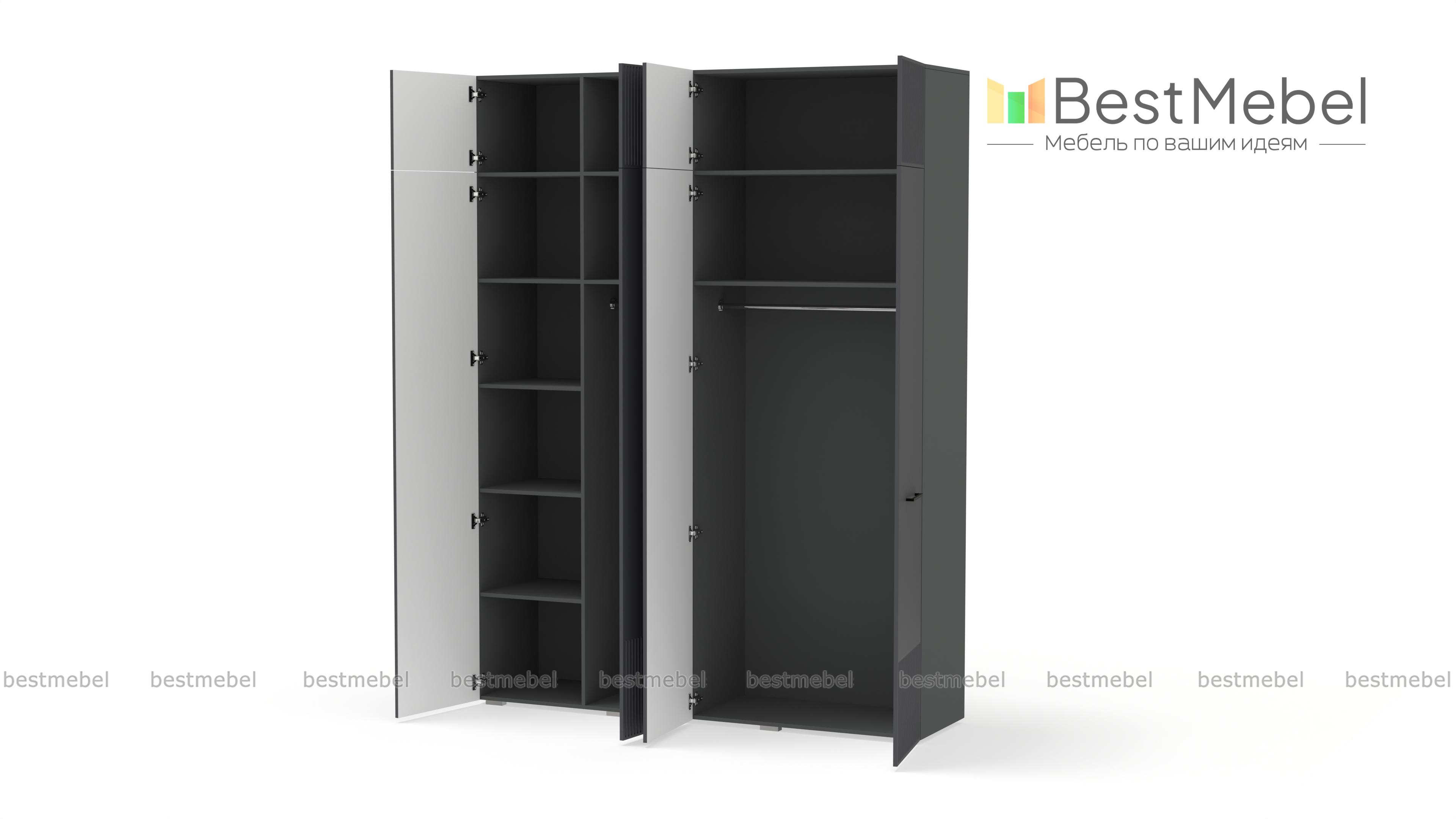 Шкаф распашной Декарт 10 BMS предоставляет еще больше места для хранения ваших вещей благодаря антресоли. В правой части высокого шкафа есть штанга и полка, а в левой — штанга и дополнительный ряд полок для сложенной одежды и текстиля. Гладкий светлый фасад с рифленым декором укомплектован стильными поперечными ручками контрастного цвета. Купить шкаф распашной Декарт 10 BMS в размере и оттенках, которые вам подходят, можно по доступной цене на сайте нашего интернет-магазина.