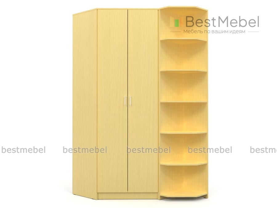 Двустворчатый угловой шкаф станет прекрасным дополнением Вашего интерьера и отличным местом хранения личных вещей. Снаружи шкаф имеет еще 6 открытых полок, на которых можно разместить литературу, фоторамки, комнатные цветы, предметы декора. Внутри шкаф оборудован 2-мя верхними широкими полками, местом для хранения одежды на плечиках и 4-мя боковыми открытыми полками для постельного белья, верхней одежды и другого. Купить такую модель можно на сайте, тут же Вами выбираются цвета и параметры изделия.